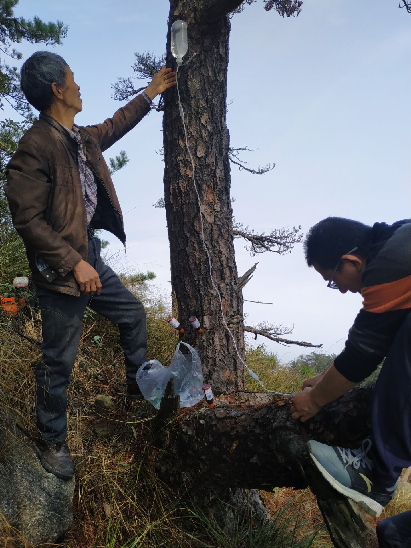 经过我站技术人员的现场勘查,这棵黄山松是由于去年干旱少雨且生长在石壁上导致的干旱脱水,我站技术人员对其采取吊挂生理盐水的方式进行救治,并进行打孔注药,防治松材线虫病乘机侵入。