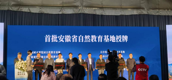 在开幕式领导致辞和讲话等议程后,主持人安徽省林学会理事长邱辉宣读了首批安徽省自然教育基地认定文件,石台牯牛降等10个自然教育基地荣幸入选。中国林学会理事长赵树丛、安徽省林业局局长牛向阳、宣城市委书记李中等领导亲自为10个省级自然教育基地代表授牌。