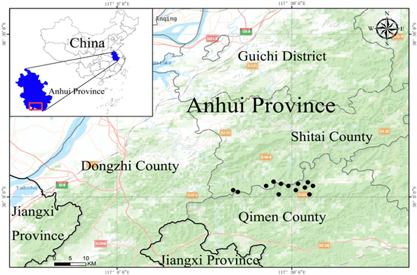 牯牛兔儿风的分布情况(图中的黑色圆点)