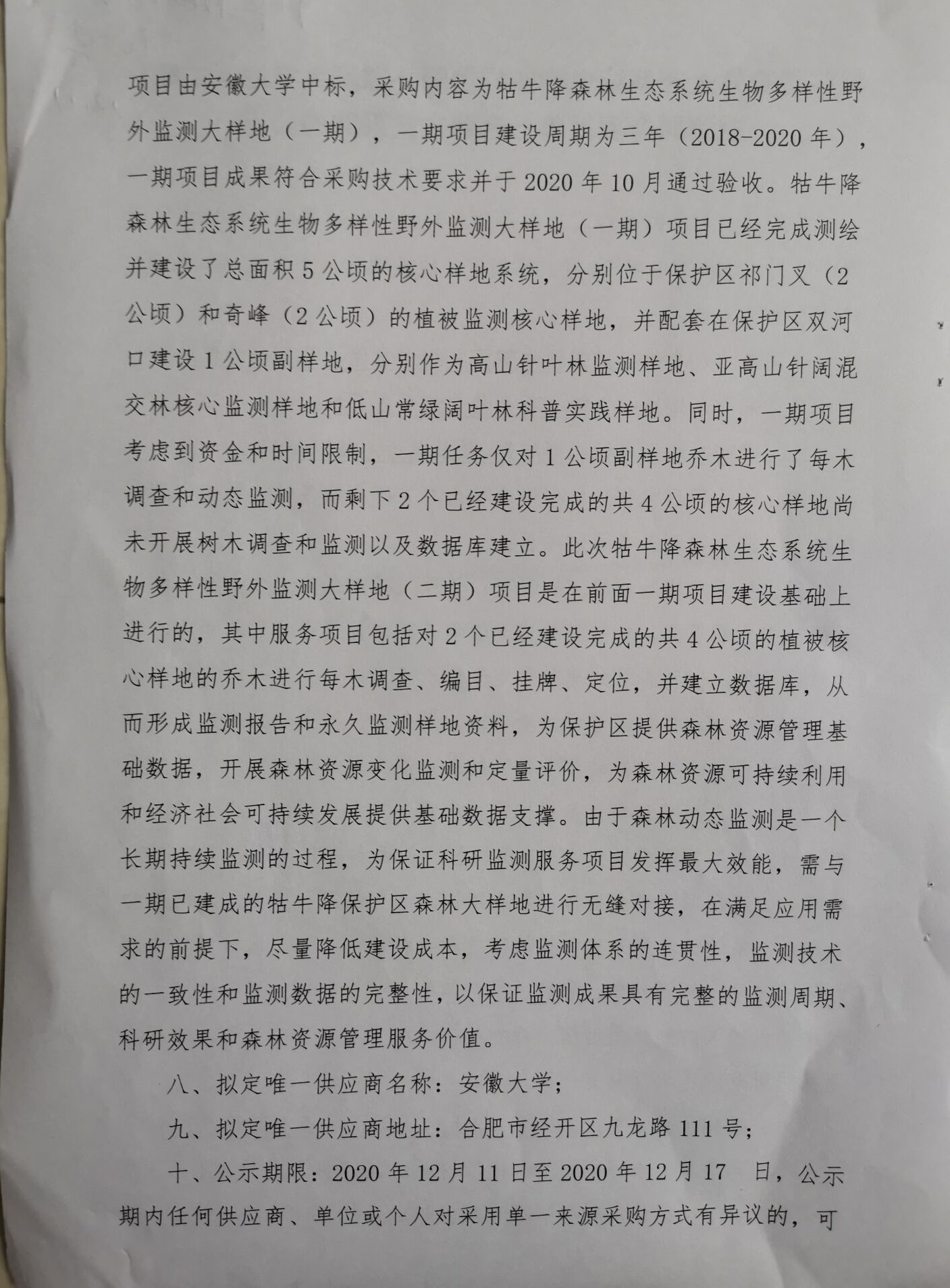 牯牛降森林生态系统生物多样性野外监测大样地(二期)监测服务项目单一来源方式采购的公示
