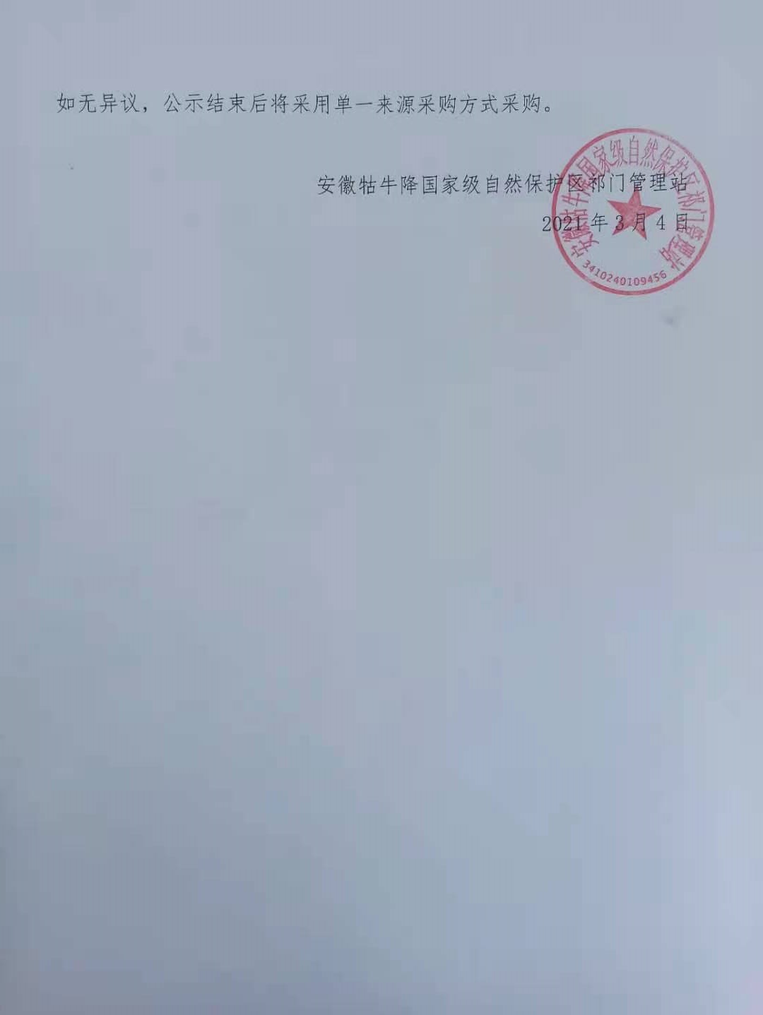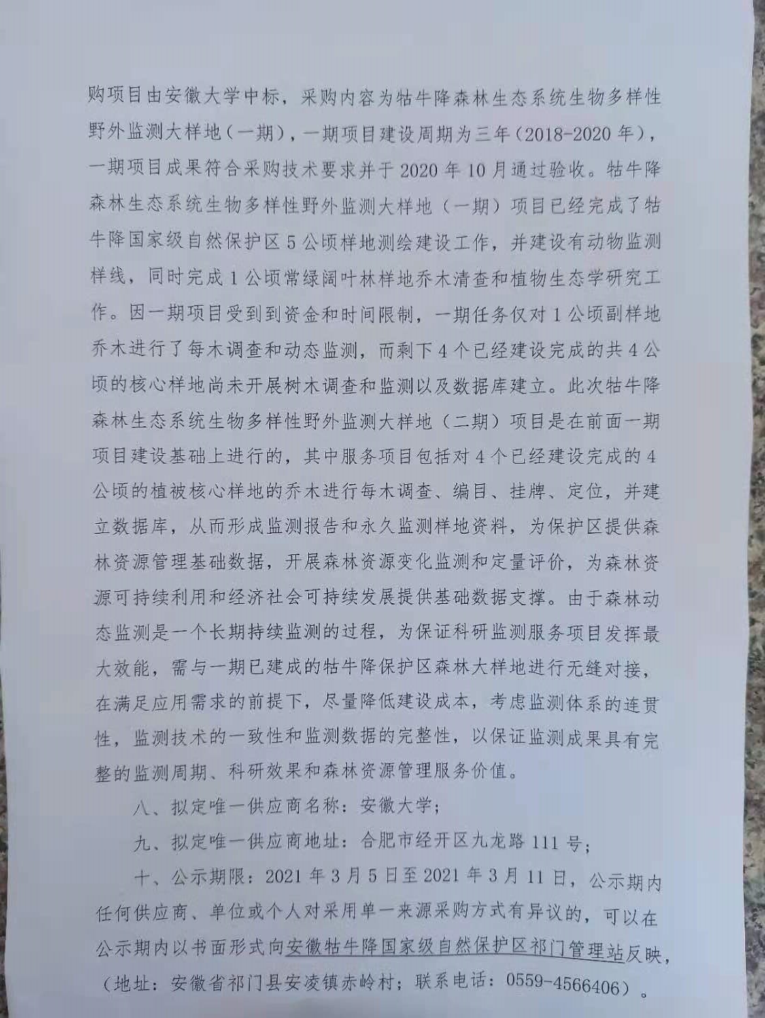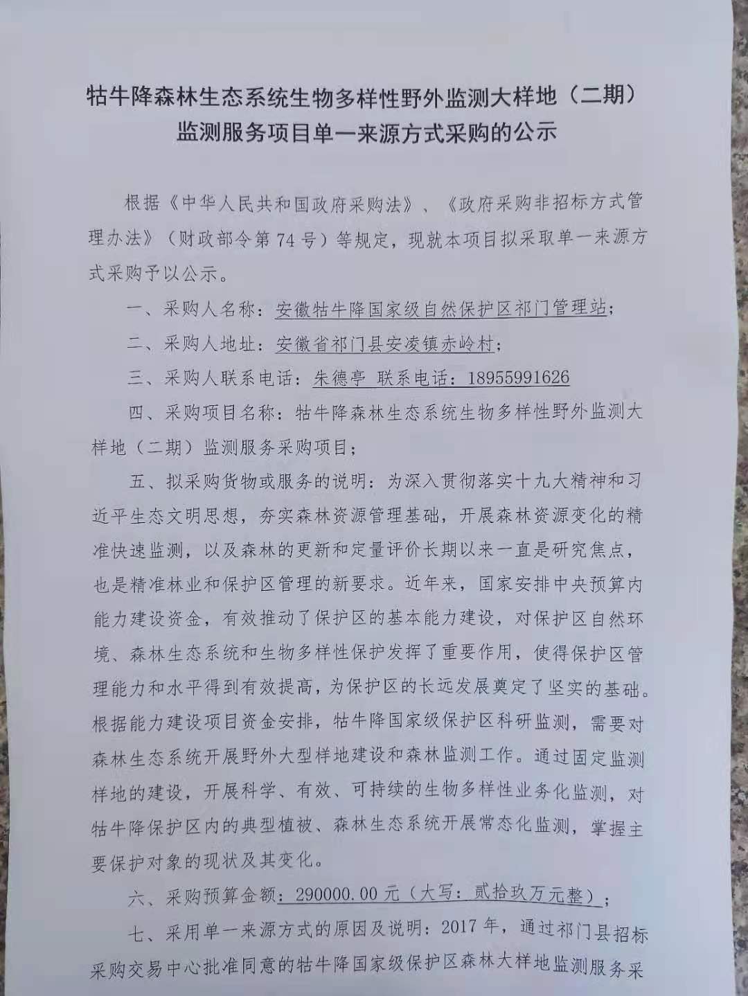 牯牛降森林生态系统生物多样性野外监测大样地(二期)监测服务项目单一来源方式采购公告(祁门管理站)