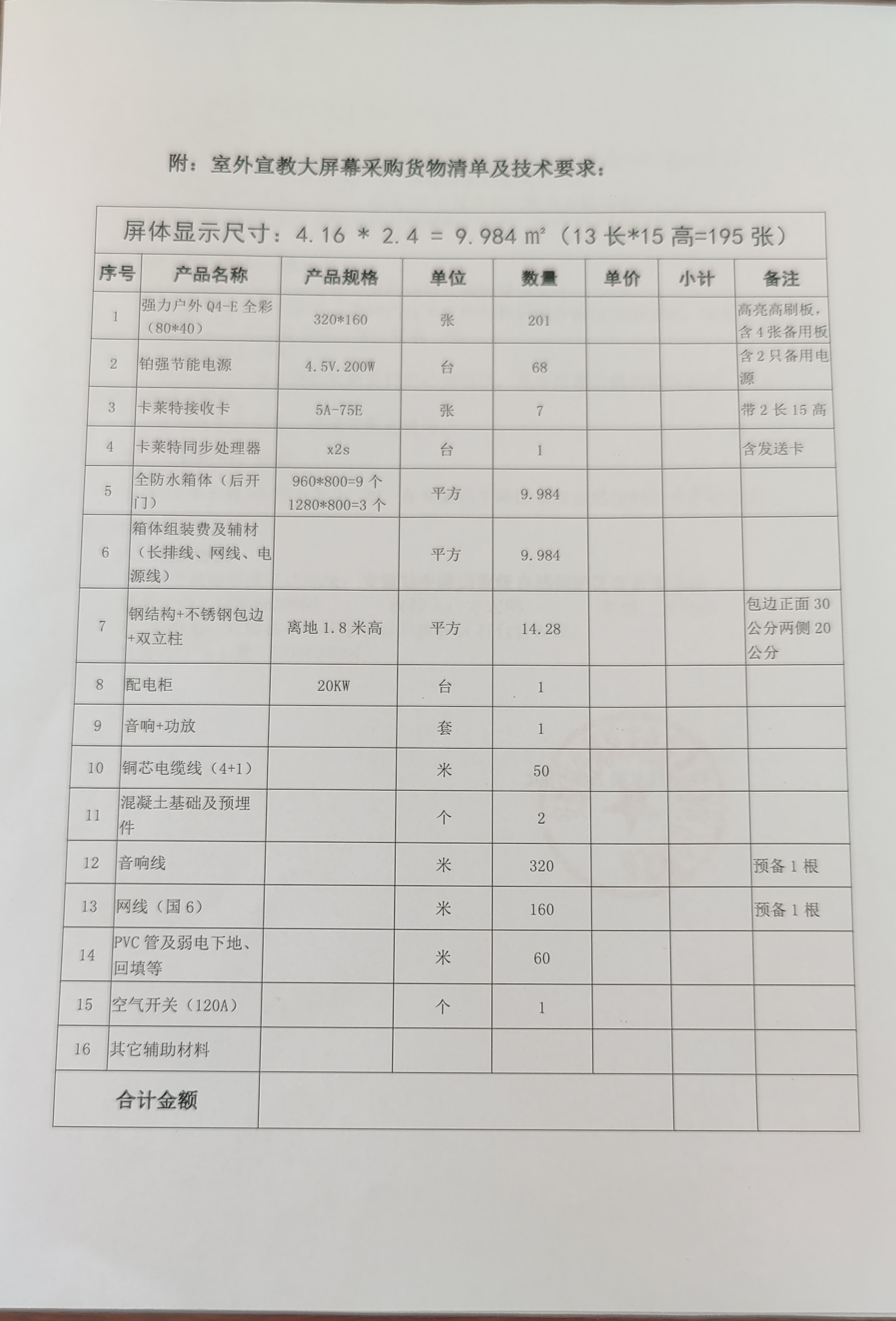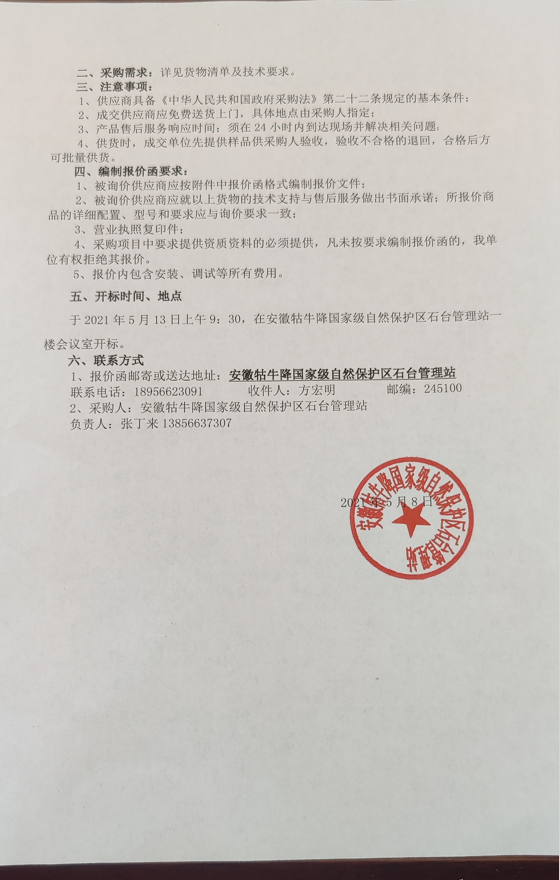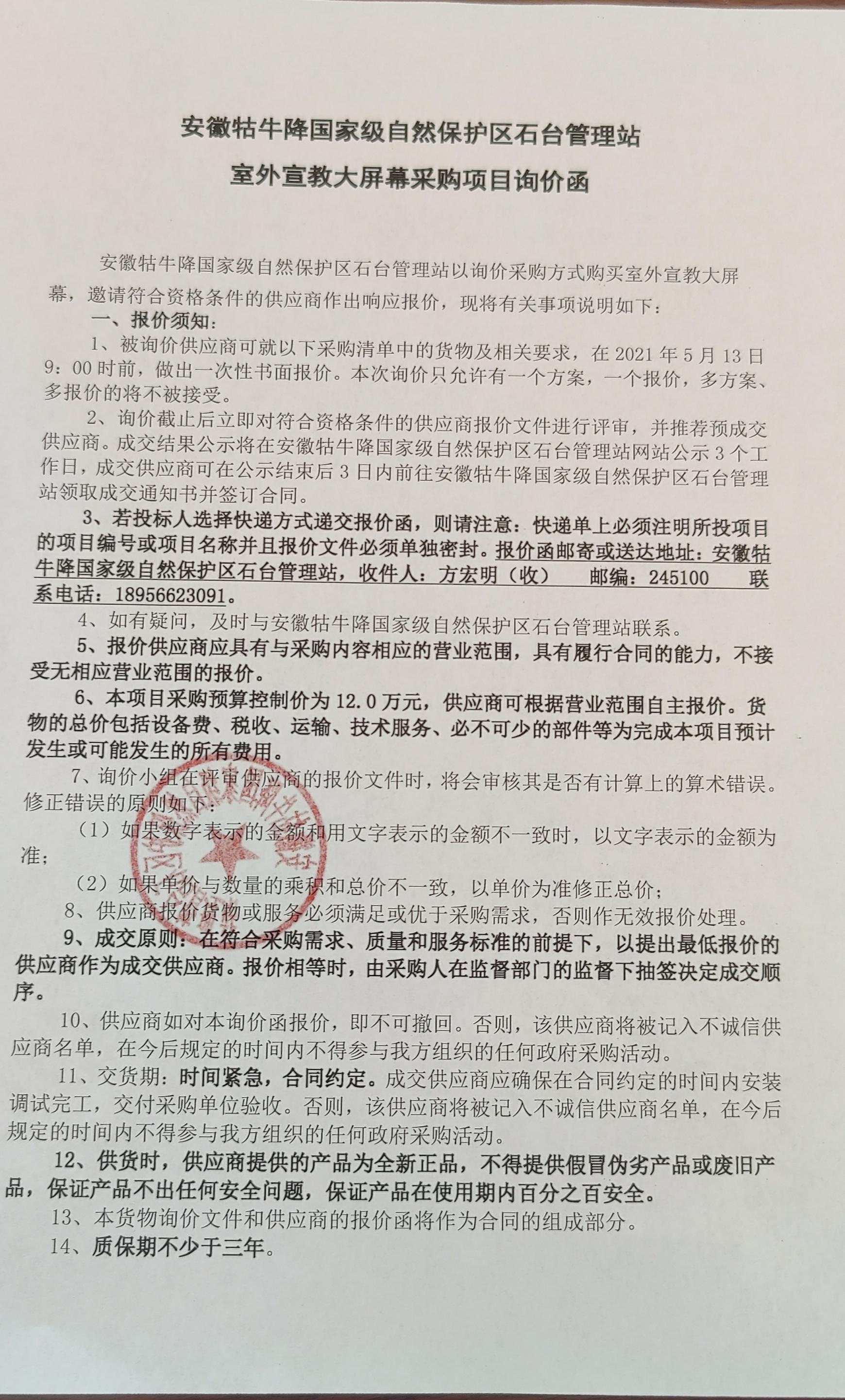 安徽牯牛降国家级自然保护区石台管理站室外大屏幕采购项目询价函