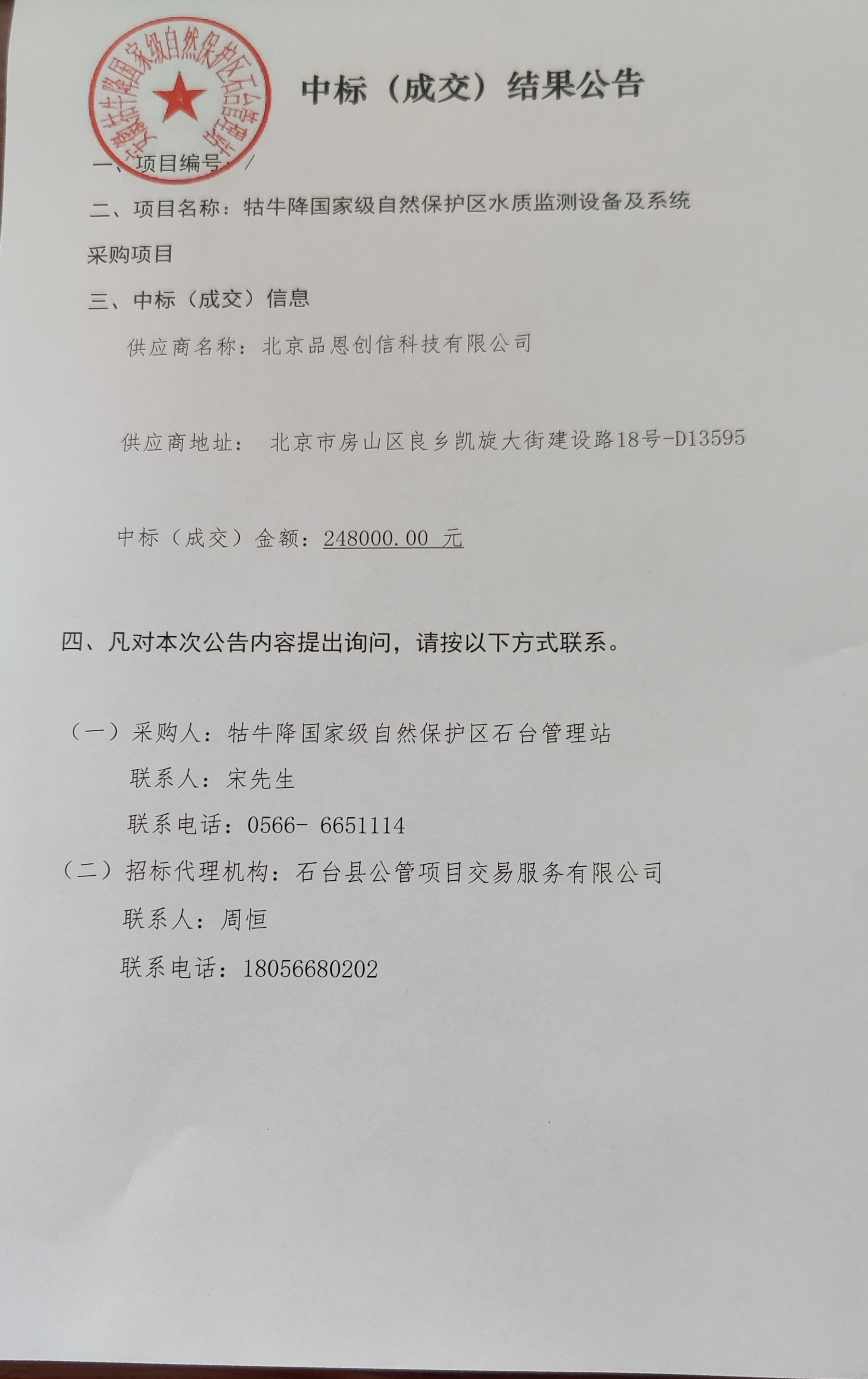 牯牛降国家级自然保护区水质监测设备及系统中标结果公告