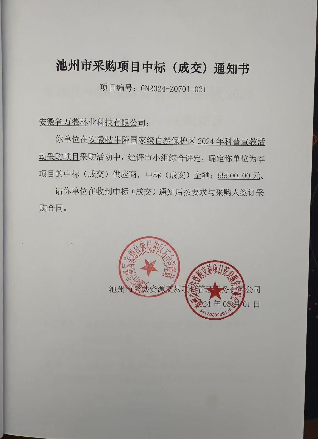 安徽牯牛降国家级自然保护区2024年科普宣教活动采购项目中标结果公告